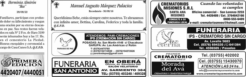Fúnebres del Viernes 30 de Septiembre de 2022