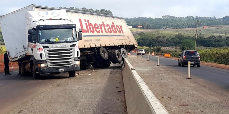 La imagen habla por sí sola. Este sábado por la mañana, por causas que se tratan de establecer, un camión impactó y terminó “trepado” sobre el paredón que separa los carriles de la ruta 105.