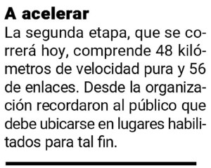 La segunda etapa arrancará hoy desde las 8.58 para los autos, con la largada del quinto especial, que unirá la ruta provincial 225 con Los Pinos, mientras que a las 9.41 se correrá el trazado que unirá exSenio con el acceso a Colonia Chatón. A las 11.29, en tanto, se repetirá el primer especial del día, mientras que a las 12.07 los autos volverán a unir exSenio con Colonia Chatón.