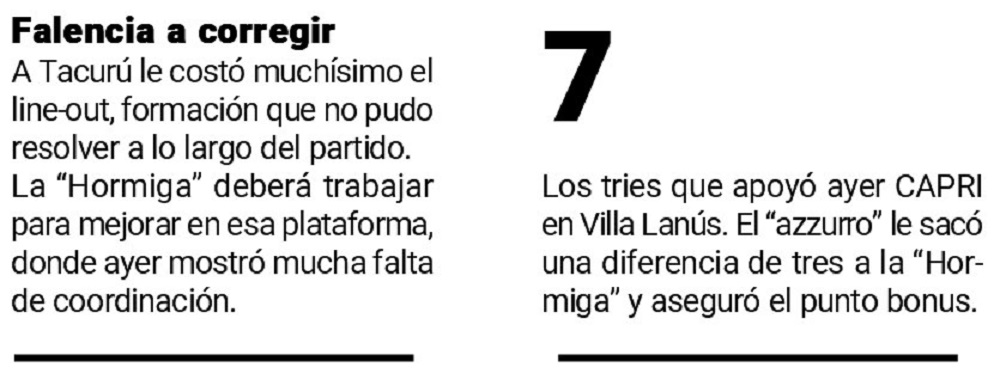Pero el peso de pack “azzurro” volvió a aflorar luego de un par de jugadas cerradas y el pilar Luca Quiñones, a los 37, y el hooker Camilo Insaurralde, a los 40, vulneraron el ingoal de Tacurú y sentenciaron el clásico con una clara y holgada victoria favorable a CAPRI por 43 a 24.