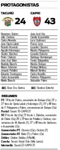 CAPRI se puso en ventaja a los 14 con un try del fullback Sebastián Falero, mientras que “Tacu” lo dio vuelta con ensayos de dos de sus fowards, el segundo línea Ojeda Labat y el tercera Agustín Kolomiejec, a los 25 y 27 minutos, respectivamente.