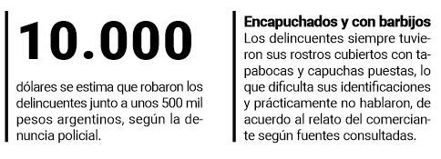 En este contexto, bajo amenazas con armas de fuego que el denunciante no supo describir, consiguieron el dinero que formaba parte de la recaudación del día (500 mil pesos) y unos dólares que el propietario tenía guardados en el local comercial.