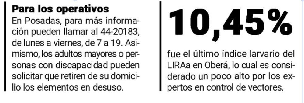 La aparición de criaderos de mosquitos que transmiten el dengue vuelve a ser tema de preocupación en Oberá. En este municipio, el índice del último relevamiento de larvas efectuado del 30 de mayo al 5 de junio fue de un 10,45%, cuando un 5% ya es preocupante. En la actualidad apuntan a la limpieza en los barrios donde más larvas se encontraron, con visitas domiciliarias. Además, siguen las charlas de concientización en escuelas.