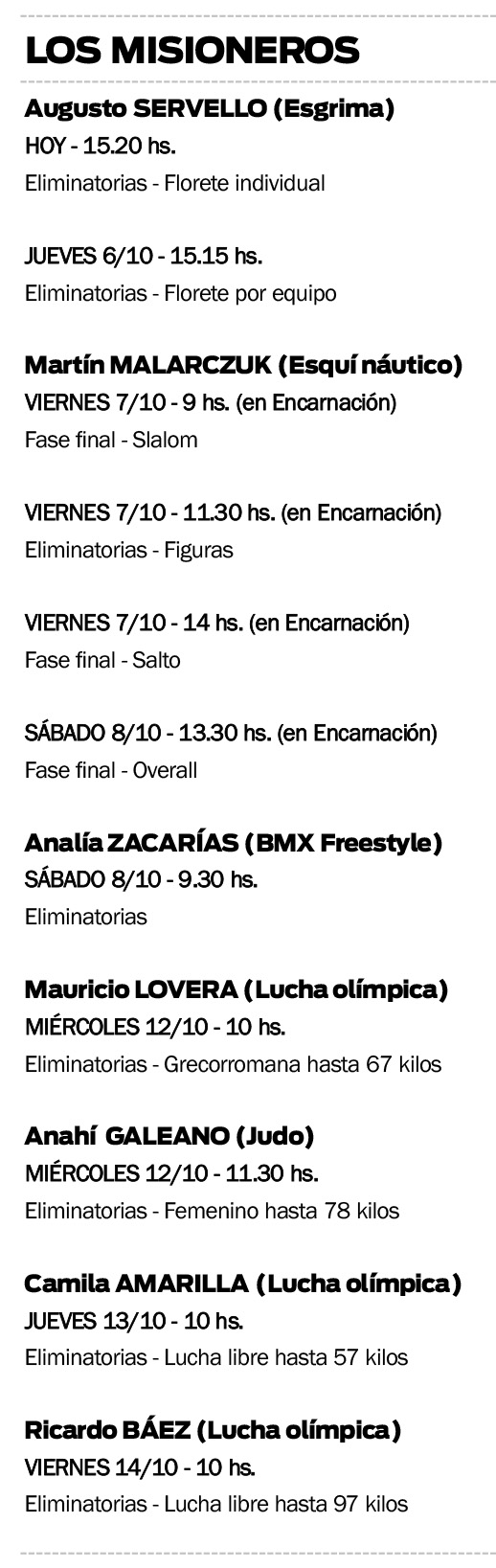 Servello, más conocido en la Selección Argentina de esgrima como “El Misionero”, abrirá la competencia hoy a las 15.20 con la ronda inicial. En caso de avanzar, disputará los octavos de final desde las 16.50, mientras que los cuartos serán a las 17.50, las semis a partir de las 18.25 y la final, prevista para las 19.30. El jueves, en tanto, Servello volverá a competir nuevamente en florete, pero por equipos, junto a la Selección.