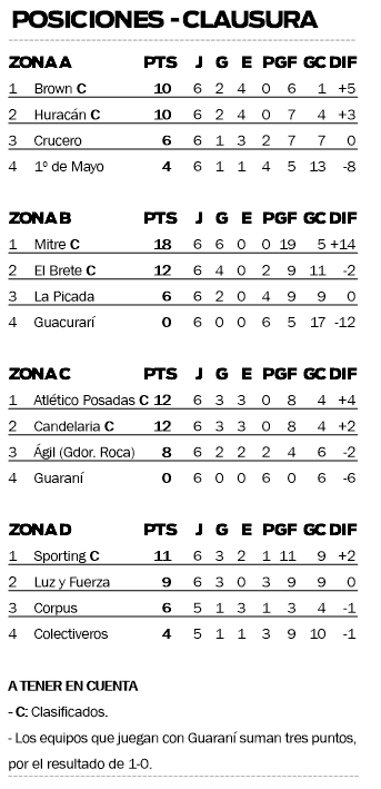 Los clasificados a los cuartos de final, hasta el momento, son Jorge Gibson Brown, Huracán, Bartolomé Mitre, El Brete, Atlético Posadas, Candelaria y Sporting de Santo Pipó. Queda un solo cupo y saldrá de la Zona D, cuando Corpus y Colectiveros jueguen el encuentro suspendido el pasado viernes.