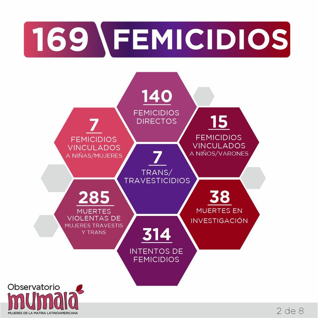 El Registro Nacional de Femicidios, Femicidios Vinculados, Trans/Travesticidios, Lesbicidios y otros decesos de las mismas características a cargo del Observatorio denominado “MuMalá”: “Mujeres, Disidencias, Derechos” detectó datos alarmantes.