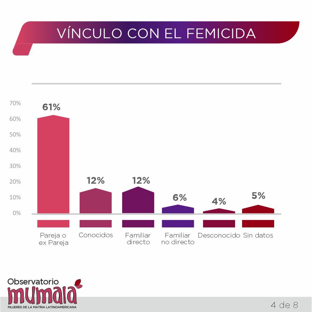 En cuanto a los femicidas, en esas provincias el 61% de los crímenes fue cometido por parejas o ex parejas de las víctimas; el 12% por hombres familiares directos y el 12% por conocidos de la víctima. A su vez, los familiares indirectos se enmarcaron dentro del 6%, el 4% incluyó a desconocidos y únicamente en el 5% de los casos no se poseen datos del femicida.