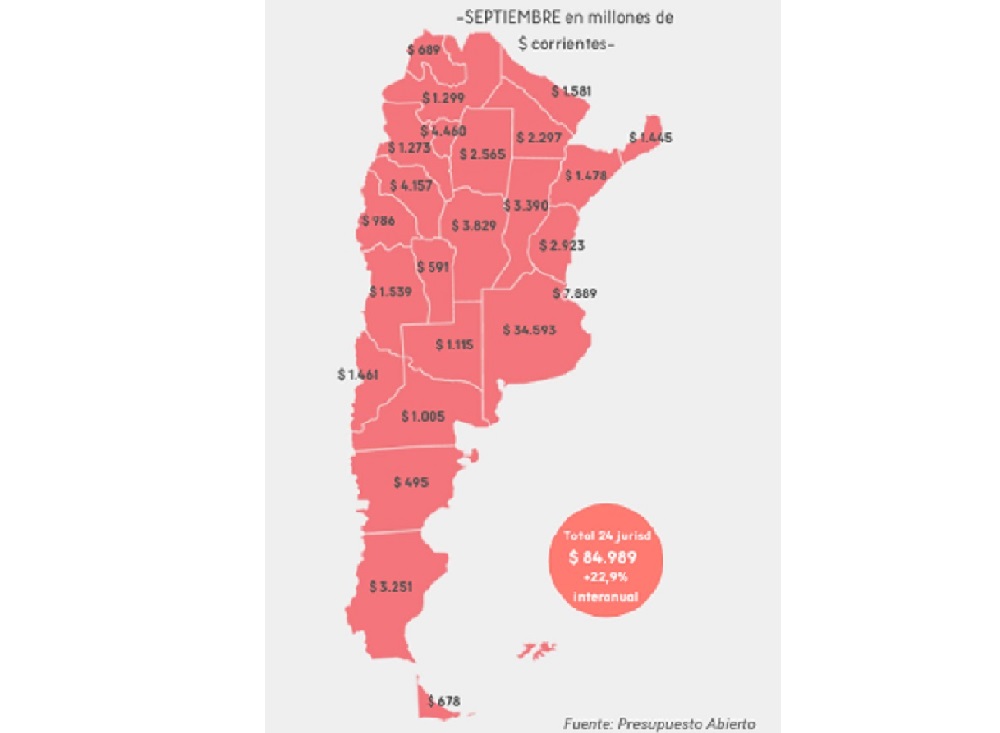Así, fue la única provincia en la región que registró un porcentaje negativo, debido a que Chaco recibió en septiembre 2022 $2.297,1 (+94,6% de forma interanual), Corrientes obtuvo $1.478,0 (+47,3%), y Formosa $1.580,7 (+53,4%).