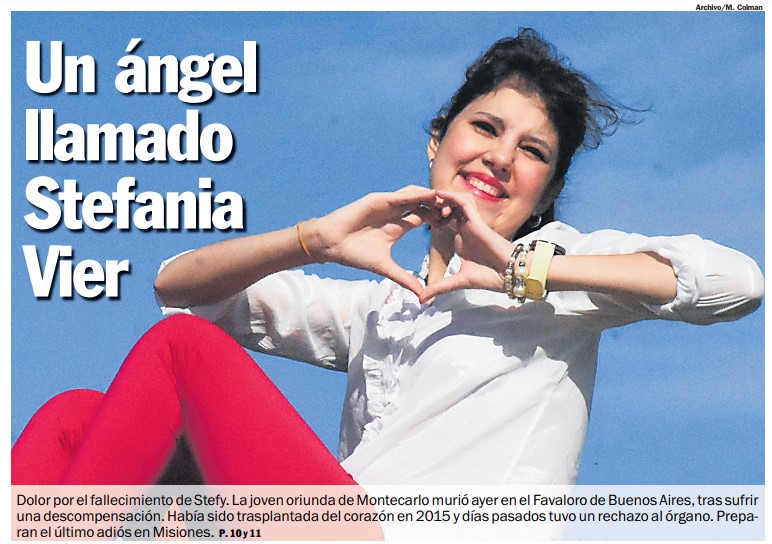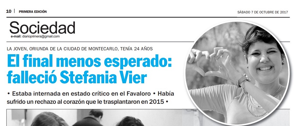 El viernes 6 de octubre de 2017 por la tarde fallecía Stefania Vier, la joven de Montecarlo que había recibido un trasplante de corazón en mayo de 2015, quien estaba internada en estado crítico en la Fundación Favaloro desde el miércoles anterior.