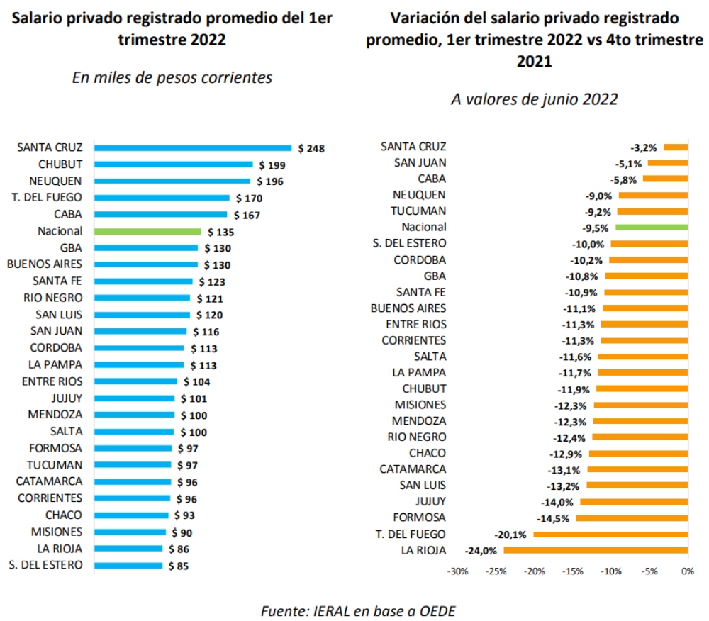 Por ejemplo, si se compara el salario real promedio del cuarto trimestre de 2021 contra el salario real promedio del primer trimestre de 2022, Tierra del Fuego (-20,1%) y La Rioja (-24%) fueron las más perjudicadas en términos de poder adquisitivo. Estas últimas dos variaciones tienen una particularidad: se trata de provincias antagónicas en cuanto a salario promedio absoluto: mientras que La Rioja es la segunda provincia con salarios más bajos, Tierra del Fuego es la cuarta con salarios más altos. Es por ello que una variación negativa de tal magnitud resulta relativamente más perjudicial para los trabajadores riojanos.