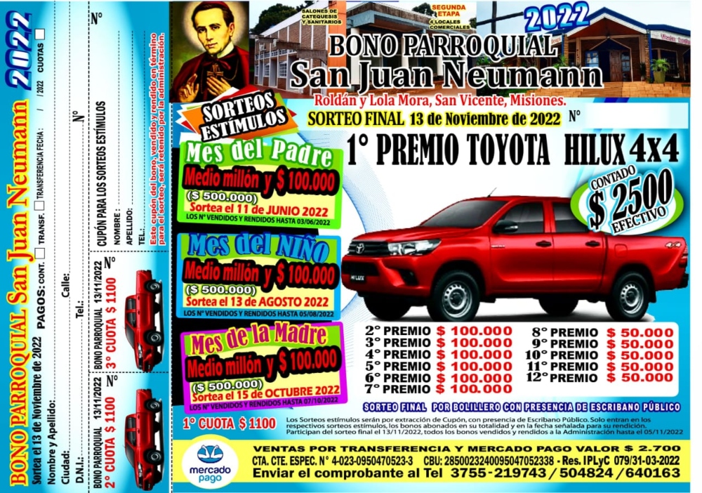 Además explicó que el proyecto está pensado a 20 años, ya que los fondos son enteramente de la rifa anual que tienen y con la cual colabora casi toda la provincia, sólo el año pasado vendieron 15.057 bonos. “El proyecto entero cuenta con cinco etapas, hicimos dos y ahora comenzamos con la tercera, hicimos salones de catequesis y locales y la tercera etapa son el cine y el teatro que es uno solo. Los fondos los recaudamos con una rifa anual que este año sortea una Toyota Hilux 4×4 el 13 de noviembre, hay muchas parroquias e instituciones que nos ayudan a vender y ubicar el bono que cuesta 2.500 pesos al contado y hay muchos premios. Además tenemos mucha gente que anualmente colabora con nosotros. Todo lo recaudado va, en este caso que se inició la tercera etapa, para la estructura del cine-teatro”.