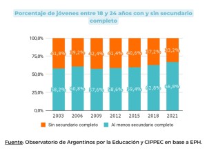 También creció el porcentaje de graduados del nivel: la proporción de jóvenes que completaron la secundaria aumentó 14 puntos porcentuales entre 2003 y 2021. En 2021, tenía título secundario el 66,8% de los jóvenes de 18 a 24 años y el 72,3% de 25 a 29 años. Estas cifras rondaban el 60% en 2003.