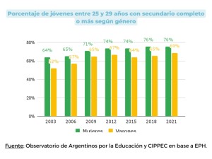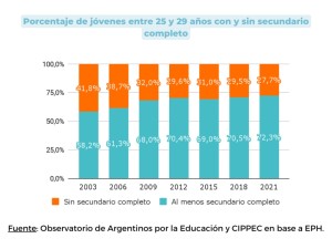 En los últimos 15 años “la cantidad de jóvenes que obtuvo el título secundario aumentó en forma sostenida; sin embargo, esas mayores oportunidades educativas no encontraron el correlato en mayores oportunidades laborales. En 2021, un tercio de los jóvenes de entre 25 y 29 años con secundaria completa había logrado acceder a empleos de calidad, mientras que en 2006, el porcentaje era del 40%.