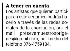 Por eso, los artistas misioneros de la música, el canto y la danza regional interesados en participar de este certamen, organizado por la Asociación Civil Preservar Nuestros Orígenes, todavía están a tiempo de sumarse a través de las redes sociales de la asociación: Instagram, Facebook y Correo electrónico: @preservarnuestrosorigenes; por el mail [email protected]; y por medio del teléfono 376-4759184, o completando el formulario del linkhttps://forms.gle/96VTEpoWGJd8mrwA9.