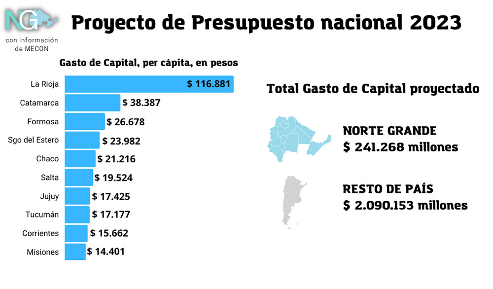 En el Norte Grande, el gasto de capital ajustado por población muestra que, en La Rioja, el monto a equivale a $ 116.881 por riojano, pero en Misiones (última en la tabla regional) equivale a apenas $ 14.401 por habitante. Esta situación señala la falta de criterio a la hora de repartir recursos, principalmente los que refieren a la inversión pública y hacen al grado de desarrollo en cada provincia.