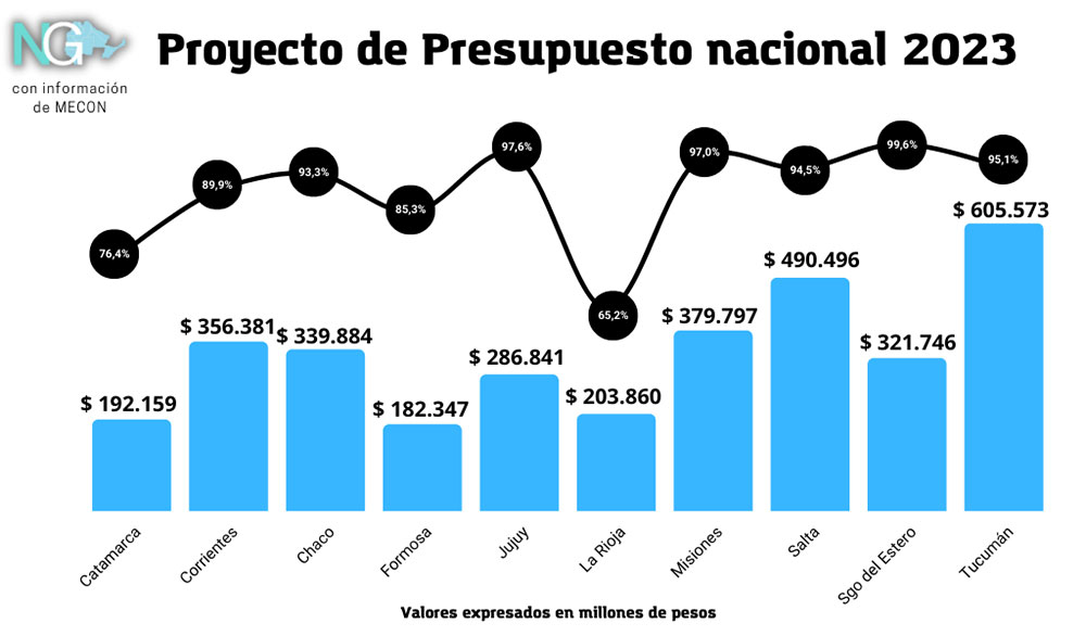 Desglosando el gasto según ubicación geográfica, el Ejecutivo nacional plantea erogar unos 3,4 billones de pesos en el Norte Grande: el 62% de ese total en el NOA (por $ 2,1 billones) y el 38% en el NEA (por $ 1,2 billones).