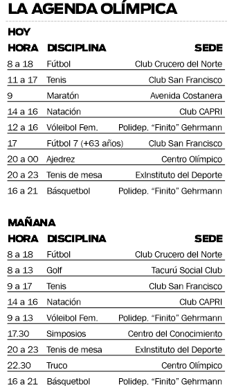 El telón se abrirá hoy desde las 8 con la disputa de los primeros partidos de fútbol, en el Club Crucero del Norte, mientras que a las 9 arrancará la maratón, tradicional prueba que servirá de apertura oficial de la cita que reúne a profesionales de todo el país.