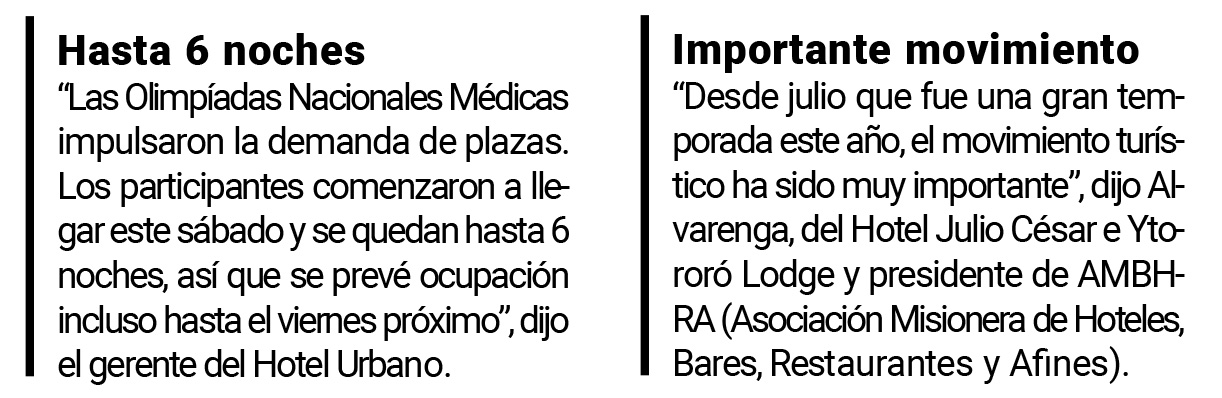 Explicó que con las Olimpíadas Médicas Nacionales llegó mucha gente que se sumó a las que decidieron viajar por el fin de semana largo. “Desde julio que fue una gran temporada este año, el movimiento turístico ha sido muy importante”, dijo Alvarenga, del Hotel Julio César e Ytororó Lodge.