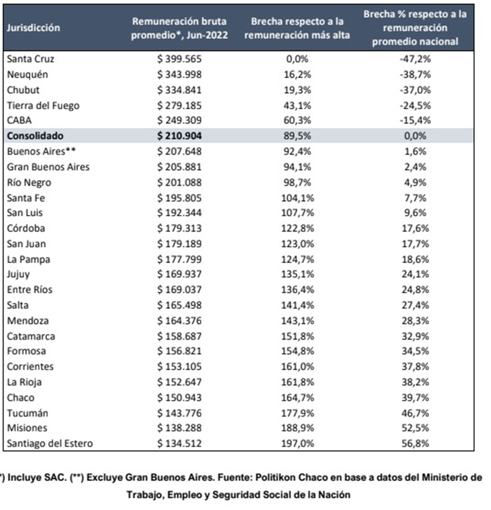 El listado está encabezado por la provincia de Santa Cruz, que muestra la mayor remuneración promedio con un total de $ 399.565 en junio 2022; le sigue Neuquén con $ 343.998 y Tierra del Fuego con $ 334.841. Las otras dos jurisdicciones que completan el lote son Tierra del Fuego con $ 279.185 y la CABA con $ 249.309.