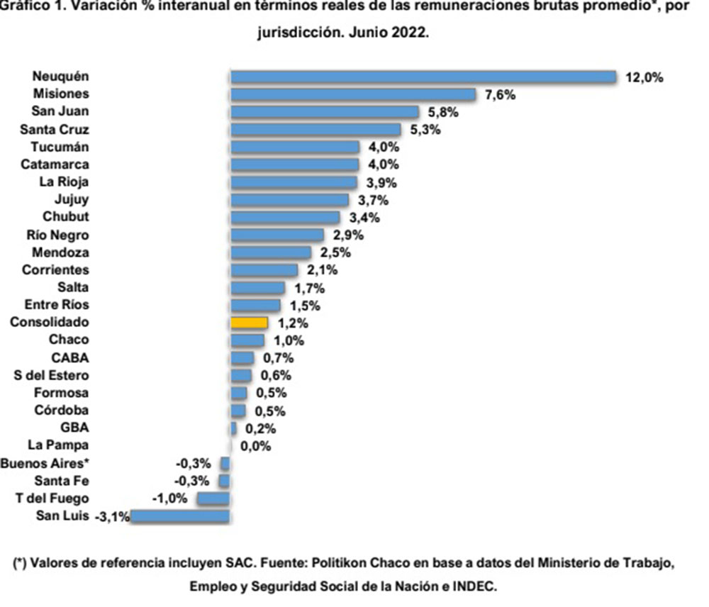 “Realizando el cálculo a pesos constantes deflactando por IPC nacional (base diciembre 2016), se observa que veinte distritos tuvieron una expansión real del salario promedio contra el mismo mes del año anterior. Además, una no tuvo variación, y las restantes mostraron caídas”, indicó Politikon.