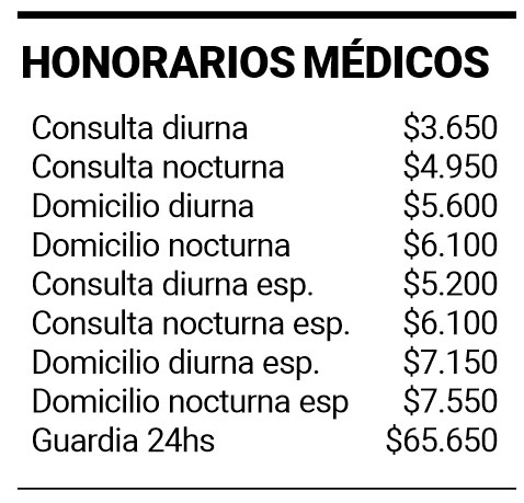 De acuerdo a la nueva tabla de honorario ético, actualizada este mes, el valor sugerido de la consulta diurna es de 3.650 pesos, de la consulta nocturna 4.950 pesos, de la consulta a domicilio diurna 5.600 pesos, de la consulta a domicilio nocturna 6.100 pesos, de la consulta diurna del especialista 5.200 pesos, de la consulta nocturna del especialista 6.100, de la consulta a domicilio diurna del especialista 7.150 pesos, de la consulta a domicilio nocturna del especialista 7.550 pesos y de la guardia de 24 horas 65.650 pesos.