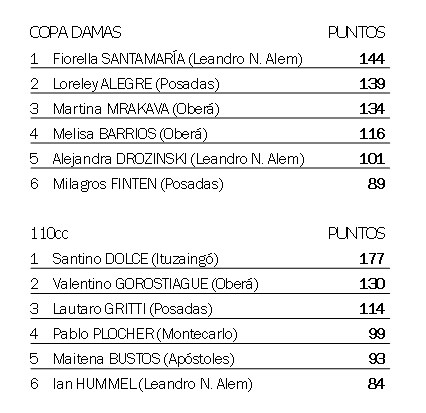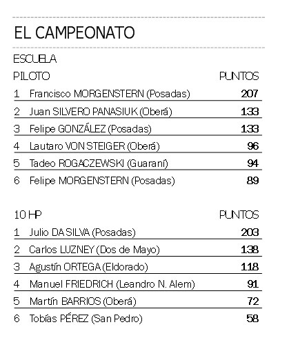 Quienes ya tienen asegurado el título son Francisco Morgenstern en la divisional Escuela, Santino Dolce en la 110cc, Julio Da Silva en la 10 Hp y Yonatan Lukoski en la Senior.