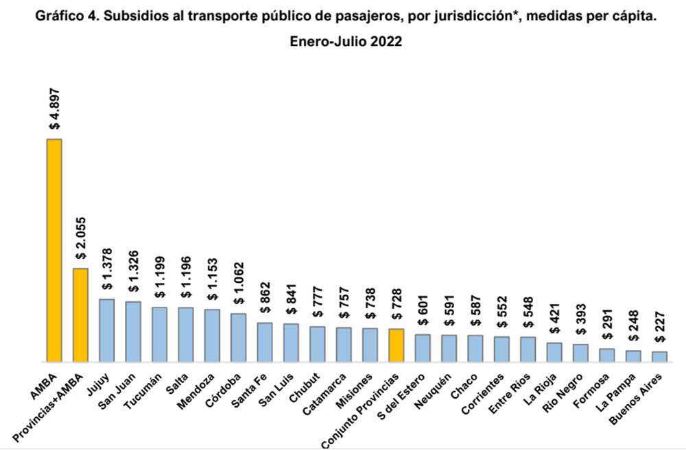 El Área Metropolitana de Buenos Aires (AMBA), con $4.897 por habitante, lidera por lejos el reparto de los subsidios al servicio de transporte público por parte del Gobierno nacional, mostrando una marcada desigualdad con el resto de las provincias del Interior. Misiones, por ejemplo recibió en el mismo período de enero a julio de 2022, la suma de $738 por cada habitante.