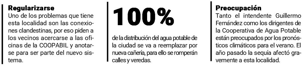 Desde el municipio y la COOPABIL ya están concientizando a los vecinos que tienen que acudir a la sede de la cooperativa para anotarse y tener acceso al nuevo sistema. Una problemática que tiene la entidad es la gran cantidad de conexiones clandestinas que hay en la localidad, por eso piden que los vecinos se acerquen a regularizar su situación y así formar parte del nuevo tendido de conexiones en el que se está trabajando.