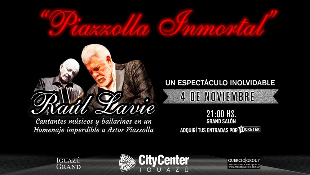 El City Center Iguazú, de la ciudad de Puerto Iguazú presenta una propuesta de excelencia para la triple frontera. Así estrenará en noviembre próximo la cartera de shows de primer nivel, cuya apertura se realiza con una de las obras musicales más famosas de la Argentina: “Piazzola Inmortal”, de la mano del cantante y compositor Raúl Lavié.