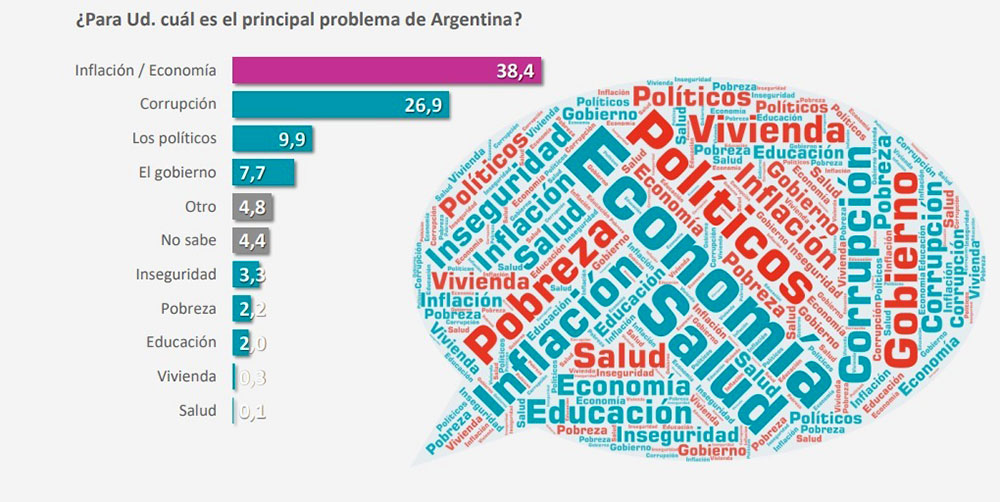Al ser consultados sobre cuál es el principal problema de la Argentina, los encuestados mencionaron en primer término a la inflación y la economía, luego la corrupción y después, en orden de aparición, a los políticos, el Gobierno, otros, no sabe, la inseguridad, la pobreza, la educación, la vivienda y la salud.