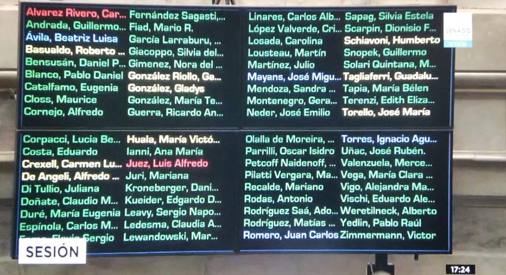La ley fue aprobada por amplia mayoría de 57 votos a favor, que aportaron los bloques del Frente de Todos, de Juntos por el Cambio y fuerzas provinciales, con 2 en contra (los representantes cordobeses de Pro, Carmen Álvarez Rivero y Luis Juez) y 9 abstenciones, entre ellas la del misionero Humberto Schiavoni.