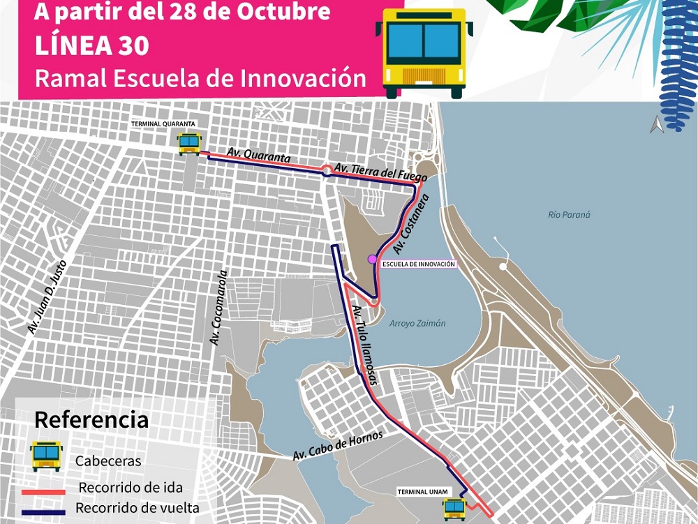 A partir de este viernes, la línea 30 “Interterminal” tendrá un nuevo ramal que se llamará “Escuela de Innovación”. El mismo posibilitará a la comunidad educativa de dicho establecimiento contar con un medio de transporte público que los deje en dicha institución.