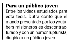 Más allá de algunas publicaciones en revistas científicas, explicó que estos misioneros consideraban que “un youtuber es una persona que realiza todas las fases del proceso de producción: piensa una idea, la graba, la edita, actúa y publica en las redes. Es algo muy diferente a la industria del cine, donde todo está sectorizado”.