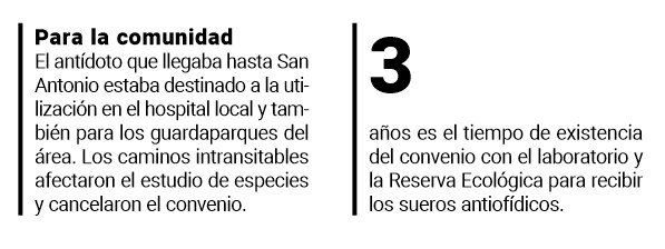 Ello se debe a que la Reserva Ecológica no pudo cumplir el convenio de colaboración mutua con un grupo de laboratorios de Buenos Aires que, a cambio de las investigaciones en terreno de las especias vegetales y animales que viven en el lugar, les permitía recibir estos sueros antiofídicos.