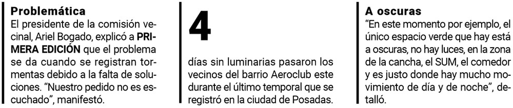 “Se hacen gestiones aunque no llegan más arriba, no tenemos una respuesta concreta, ni rápida”, agregó. Recordó que tras el último temporal que azotó la ciudad pasaron hasta cuatro días “sin alumbrado público” en varios sectores.