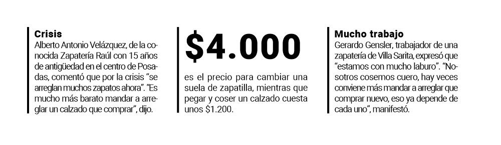 En este contexto, se disparó la demanda de arreglos en zapateros de la ciudad de Posadas, los cuales se ven atiborrados de trabajo debido a la pérdida de poder adquisitivo de los consumidores. Los costos de una reparación varían entre los $1.200 y los $4.500.