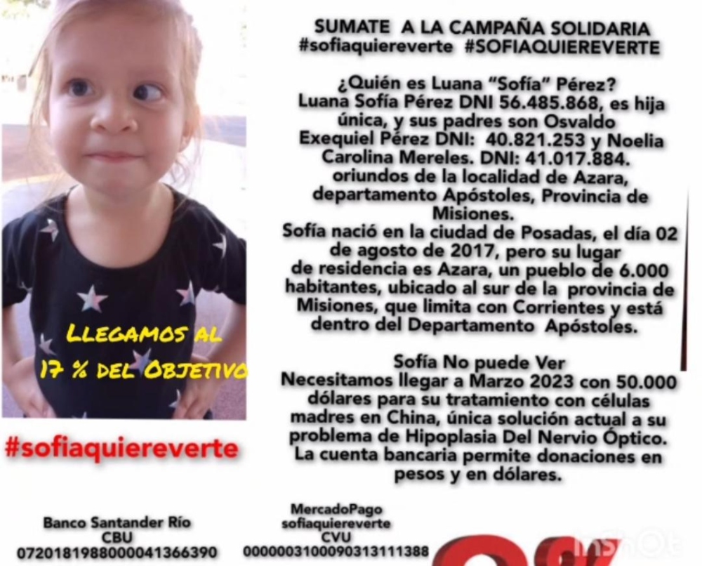 De los siete millones de pesos que pretenden juntar ya recaudaron millón y medio, así que invitó a toda la sociedad a sumarse a la campaña #SofiaQuiereVerte.