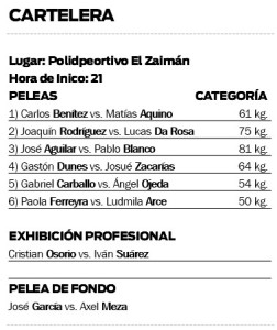 En el primero de ellos, Carlos Benítez enfrentará a Matías Aquino, en la categoría 61 kilogramos.