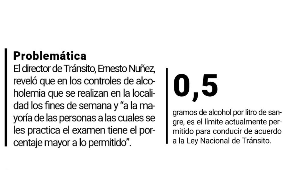 El director de Tránsito Ernesto Núñez reveló que en los controles de alcoholemia que se realizan en la localidad durante los fines de semana y “a la mayoría de las personas a las cuales se les practica el examen tiene el porcentaje mayor a lo permitido”. “Hablamos de 1,6- 2-1,5 donde el alcohol altera el temperamento de la persona que conduce el vehículo”, apuntó. Con respecto al proyecto en debate, reiteró la necesidad de contar con un bioquímico en los controles “para dar cierta certeza a la hora de hacer un examen”.