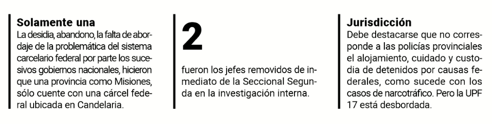 Esta difícil situación lleva a que los diferentes detenidos por delitos federales, terminen recluidos en comisarías de la Policía de Misiones que no están adaptadas para tal fin, ya que este tipo de imputados pasan por tiempos excesivamente prolongados detención.