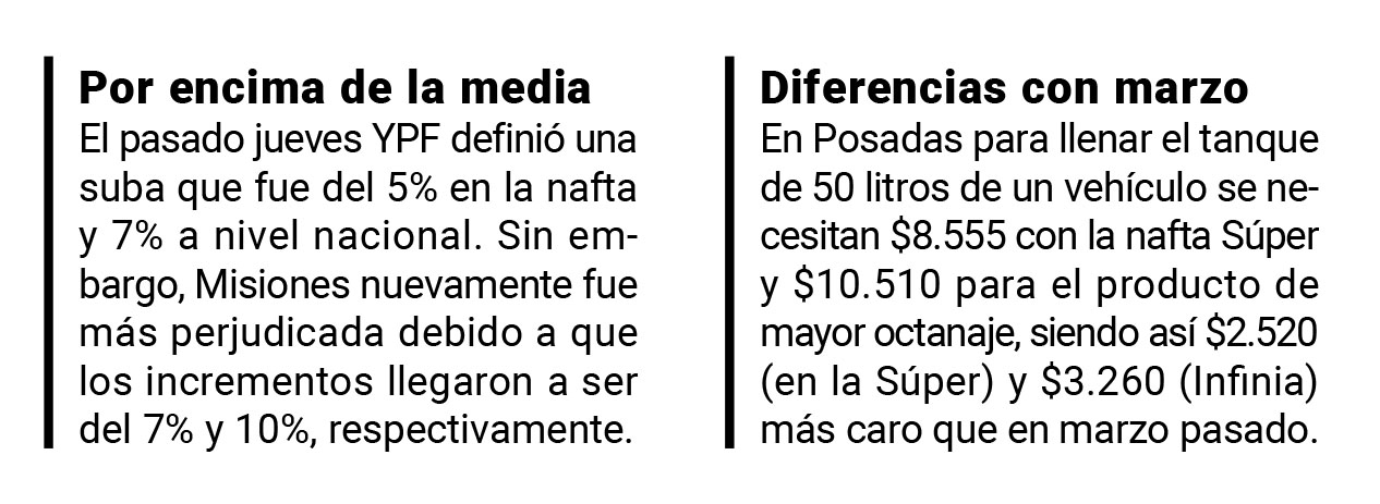 Sin embargo, Misiones nuevamente sintió subas superiores a la media nacional, considerando que la modificación porcentual llegó al 7% en los productos de la nafta y alrededor del 10% para el consumo de gasoil.