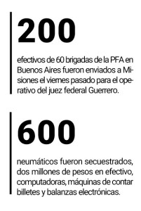 Con seguimientos que incluyeron perfiles de redes sociales, investigadores de la Policía Federal desmantelaron una organización de contrabando y distribución dentro del país de neumáticos. Fueron catorce los detenidos puestos a disposición del juez federal de Eldorado, Miguel Ángel Guerrero, 600 ruedas secuestradas y dos millones de pesos en efectivo, además de elementos para ampliar la pesquisa, parte de los datos destacados del operativo logrado a partir de la labor de la división “Triple Frontera” de la PFA.