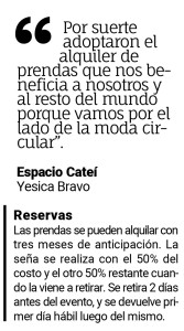Manifestó que se puede alquilar un vestido de fiesta a partir de los $16.500 y hasta los $25 mil, mientras que los trajes están $13.200. Los alquileres incluyen tres accesorios que se necesiten para completar el outfit (corbata, moño, cinto, apliques para cabello, sobres o bijou) y la tintorería posevento.