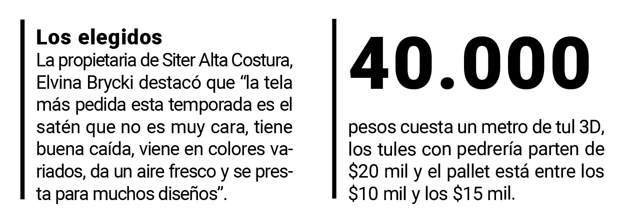 “El metro de tela pallet está entre los $10 mil y $15 mil, los tules bordados están más caros sobre todo los de pedrería pesada que parten de los 20 mil por metro, y un tul 3D supera ampliamente los $40 mil por metro”, apreció.