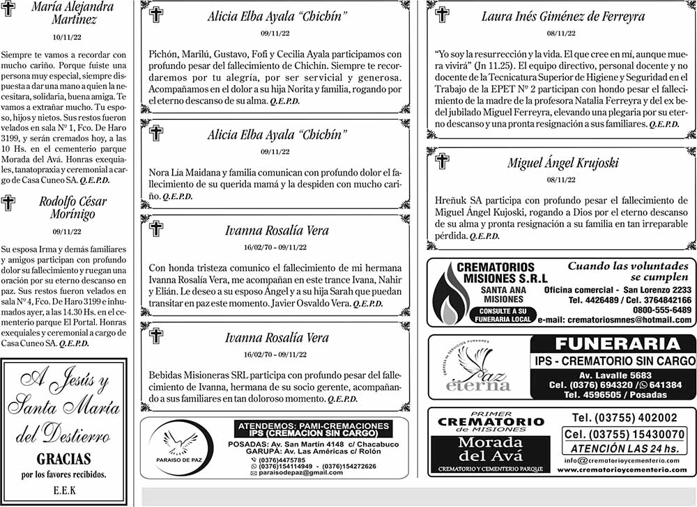Fúnebres del Viernes 11 de Noviembre de 2022