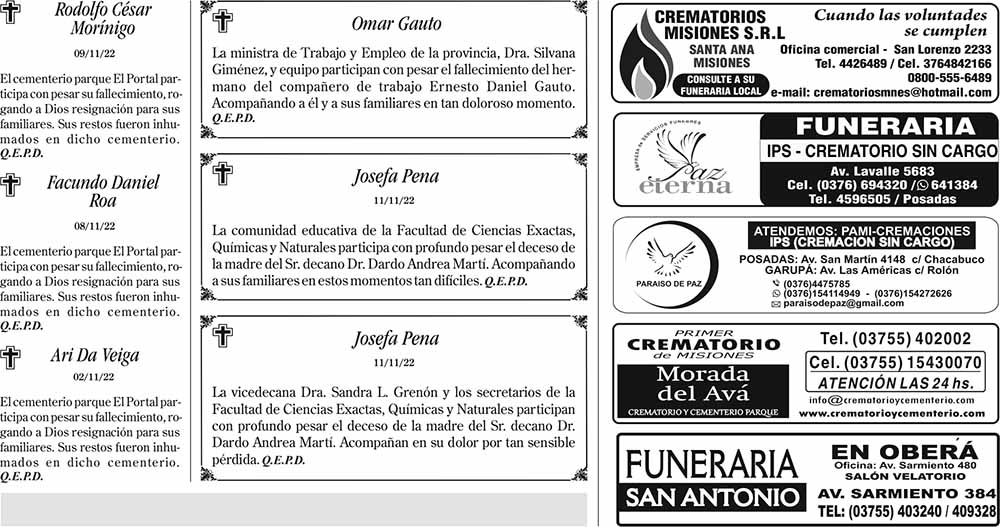 Fúnebres del Sábado 12 de Noviembre de 2022