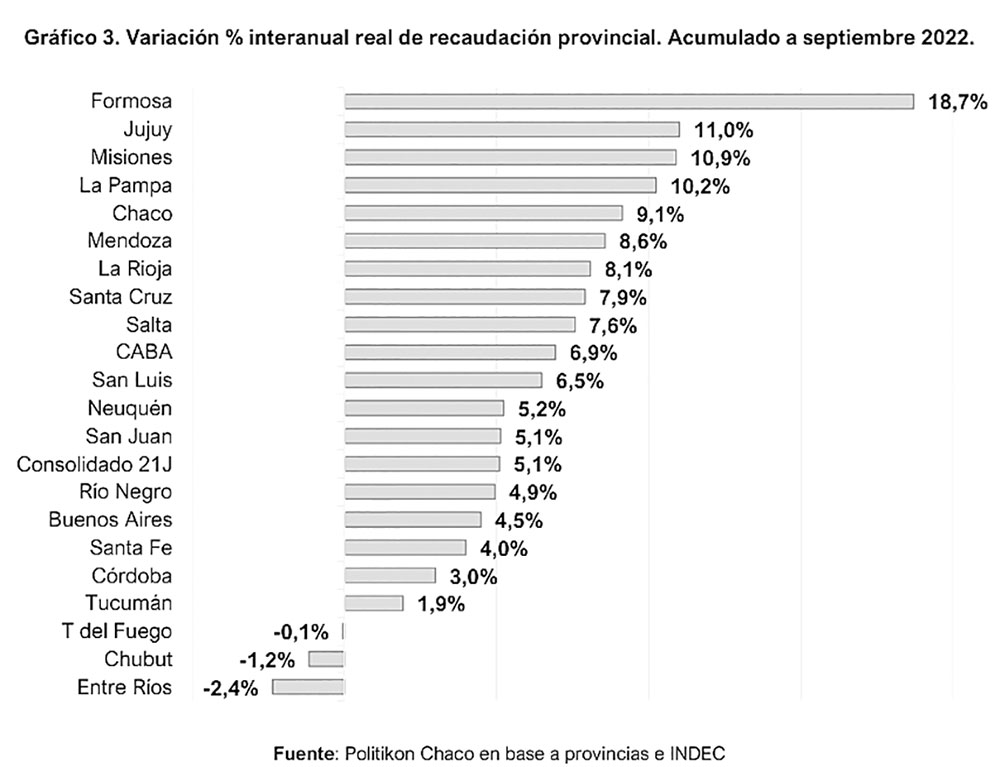 La recaudación real se incrementó 10,9% en comparación con el mismo período de 2021, solo superada por Formosa y Jujuy. En el otro extremo, Entre Ríos, Chubut y Formosa disminuyeron sus recursos. También creció la autonomía fiscal de Misiones que ahora depende menos de las transferencias nacionales.