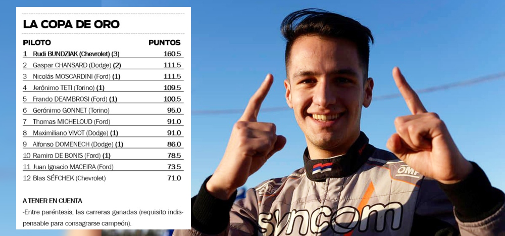 Siempre al mando del Chevrolet del Coiro Dole Racing, el oriundo de Puerto Iguazú mantiene la ventaja de 49 puntos sobre sus más inmediatos perseguidores, Gaspar Chansard (Dodge) y Nicolás Moscardini (Ford), ambos con 111.5 puntos. Rudito suma 160.5 y entre esta fecha y la última, que se correrá en San Juan el 4 de diciembre, hay 117.5 puntos en juego. A mover la calculadora.
