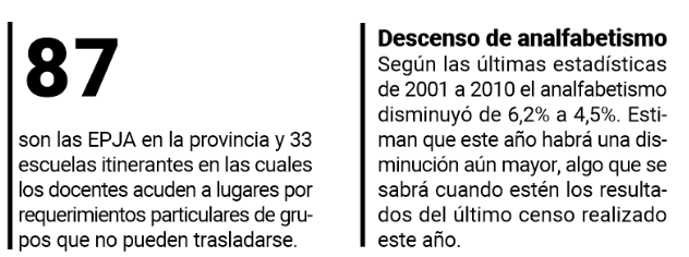 Asimismo, si bien sigue siendo una preocupación la deserción educativa, como punto positivo Capaia indicó que desde la modalidad creen que los resultados de este último censo indicarán un descenso del analfabetismo. Con esa finalidad es que cada comienzo de ciclo lectivo las EPJA salen a buscar gente en los operativos de inscripción.