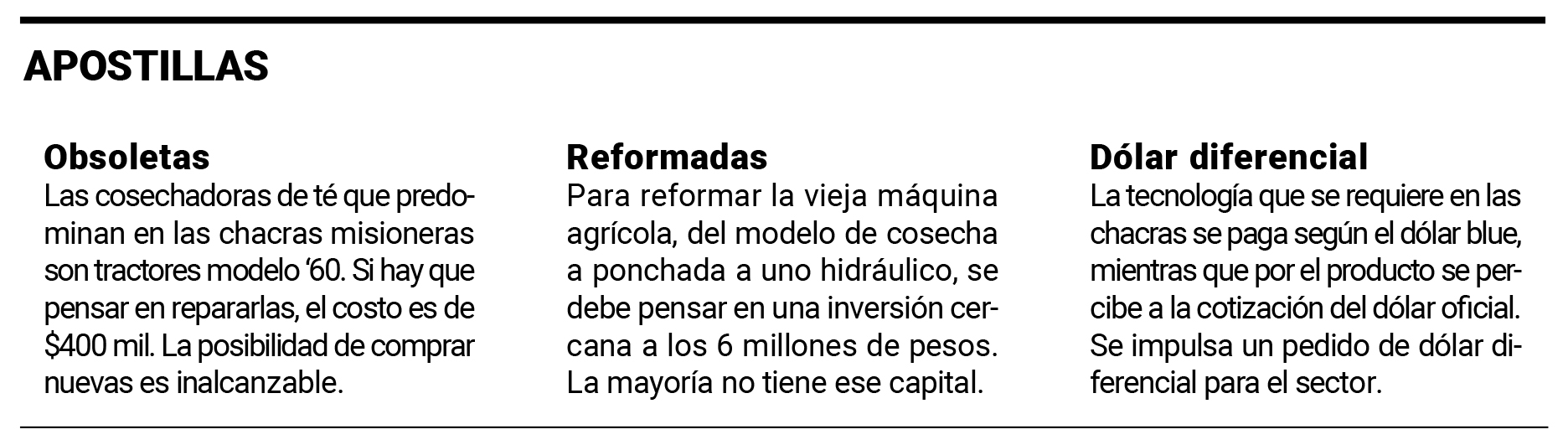 “Los productores de té, lo mismo que algunos yerbateros de Misiones, trabajan con tractores que están por encima de los 45 o 50 años de antigüedad y es imposible llegar a una cosechadora nueva por el elevado costo”, contó en tanto otro productor primario, Fabián Laban.